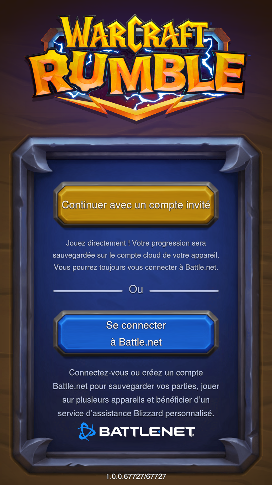 [08/08] à 21h53 : Les personnes ayant déjà eu accès à la bêta fermée et limitée peuvent de nouveau jouer à Warcraft Rumble ! Deux moyens de connexions s'offrent à elles : en se connectant via leur compte Battle.net (permettant de sauvegarder leurs parties, jouer sur plusieurs appareils et bénéficier d'un service d'assistance Blizzard personnalisé) ou ou en continuant avec un compte invité (dans ce cas-ci, leur progression sera sauvegardée sur le compte cloud de leur appareil et pourront toujours se connecter par le biais de Battle.net). Si certaines d'entre elles décident de continuer en utilisant un compte invité, la cinématique d'introduction du jeu suivie de l'artwork officiel se lanceront jusqu'à ce qu'un téléchargement se termine.