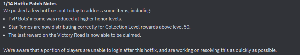 Par le biais du serveur Discord consacré au jeu, Veraci a annoncé qu'une série d'au moins trois correctifs a été déployée en jeu. Ceux-ci distribuent désormais correctement les tomes de démarrage pour les récompenses de niveau de collection supérieur au niveau 50, et réduisent les gains d'or des bots en JcJ lorsque vous êtes à des niveaux d'honneur plus élevés.