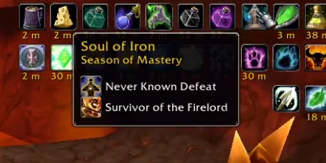 Nous félicitons tous ceux qui ont participé au défi en mode Hardcore ! Pour ceux qui ont survécu face à Ragnaros, ils ont obtenu le buff (l'amélioration) Survivant du seigneur du Feu, attaché à l'amélioration originale de l'Âme de fer, visible lorsque vous passez votre curseur dessus. Une fois que les joueurs du groupe de raid ont quitté le Cœur du Magma et sont allés à Forgefer, il y a eu une sacrée fête de bienvenue.