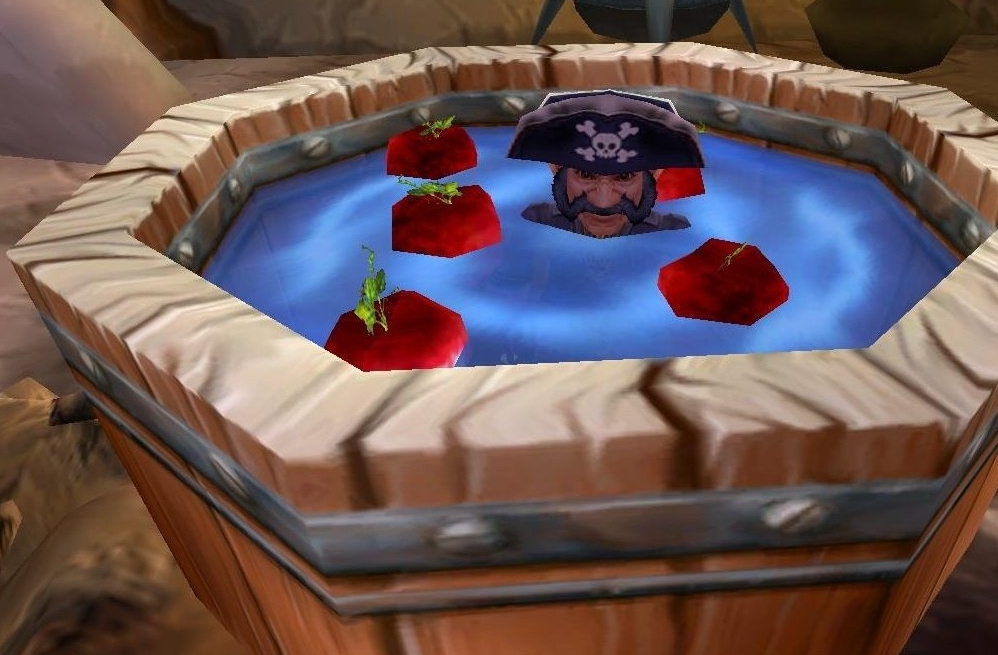 Dans toutes les auberges d'Azeroth, vous pouvez obtenir des pommes dans ce que nous appelons le "Jeu des pommes" (les seaux remplis de pommes). Vous pouvez en gagner de deux manières différentes : en cliquant simplement sur un seau ou en les pêchant : cela vous donnera 5 Pomme d'amour gratuitement. Ce consommable augmente de 15% l'endurance et l'esprit de votre personnage au niveau 60 pendant 15 minutes.