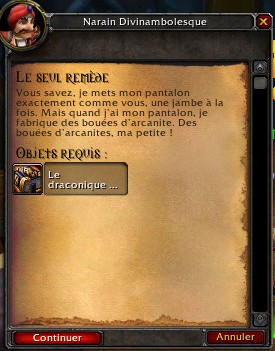 Grand livre magique puis vous demande de partir à la rencontre d’un de ses vieilles connaissances : Narain Divinambolesque, situé à Tanaris. Il s’agit d’un ingénieur gnome ayant les capacités pour déchiffrer le langage utilisé dans l’ouvrage et pouvant vous confectionner la bouée d’Arcanite.