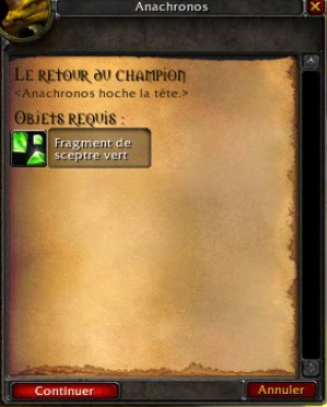 Tout d’abord, sachez qu’il ne faut avoir aucun pré-requis pour ces quêtes, si ce n’est de posséder un personnage de niveau 60. Pour commencer, rendez-vous au Fort Cénarien en Silithus, et interagissez avec Baristolth des Sables changeants. Ce dernier vous demande de rencontrer Anachronos aux Grottes du Temps, à Tanaris. En revenant auprès de Baristolth, le PNJ vous donne la quête