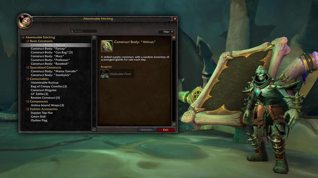 Les Nécro-seigneurs disposent d’un moyen de transport inédit pour parcourir Maldraxxus. Avec un peu d’huile de coude et quelques pièces détachées, vous pourrez utiliser la Fabrique à Abominations pour créer un ami qui assurera votre transport lors de vos aventures. Que vous préfériez voyager sur ses épaules (et admirer son petit chapeau) ou vous balader dans les champs immaculés du Bastion, vos périples ne manqueront pas de style.