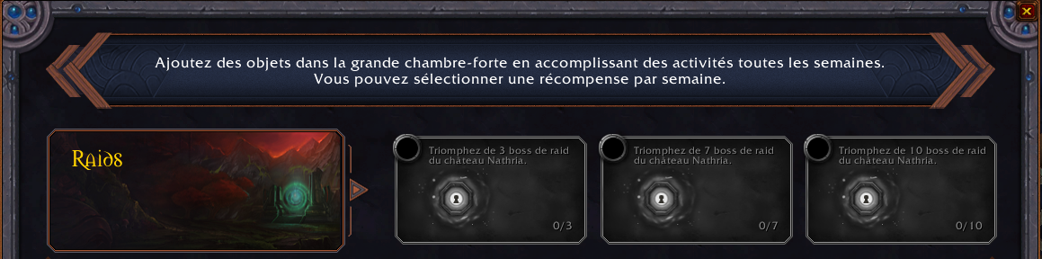 Tuer des boss au Château Nathria à n'importe quel mode de difficulté comptera dans les objectifs hebdomadaires de votre raid dans la grande chambre-forte et ajoutera la possibilité d'une option de butin du Château Nathria à vos choix lorsque vous ouvrirez votre grande chambre-forte pour sélectionner votre unique butin pour votre bonus hebdomadaire.