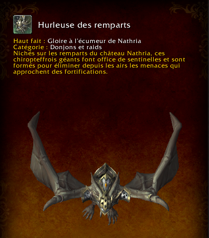 En accomplissant le haut-fait Gloire à l'écumeur de raids de Nathria, vous serez récompensés de la monture suivante : la Hurleuse des remparts.