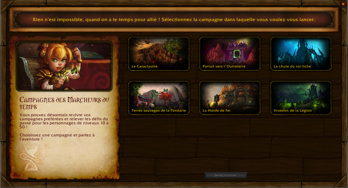 Comme le jeu l'indique, vous pouvez désormais revivre vos extensions favorites et relever les défis du passé pour les personnages de niveaux 10 à 50. Quatre campagnes vous sont proposées, chacune correspondant aux extensions de World of Warcraft :