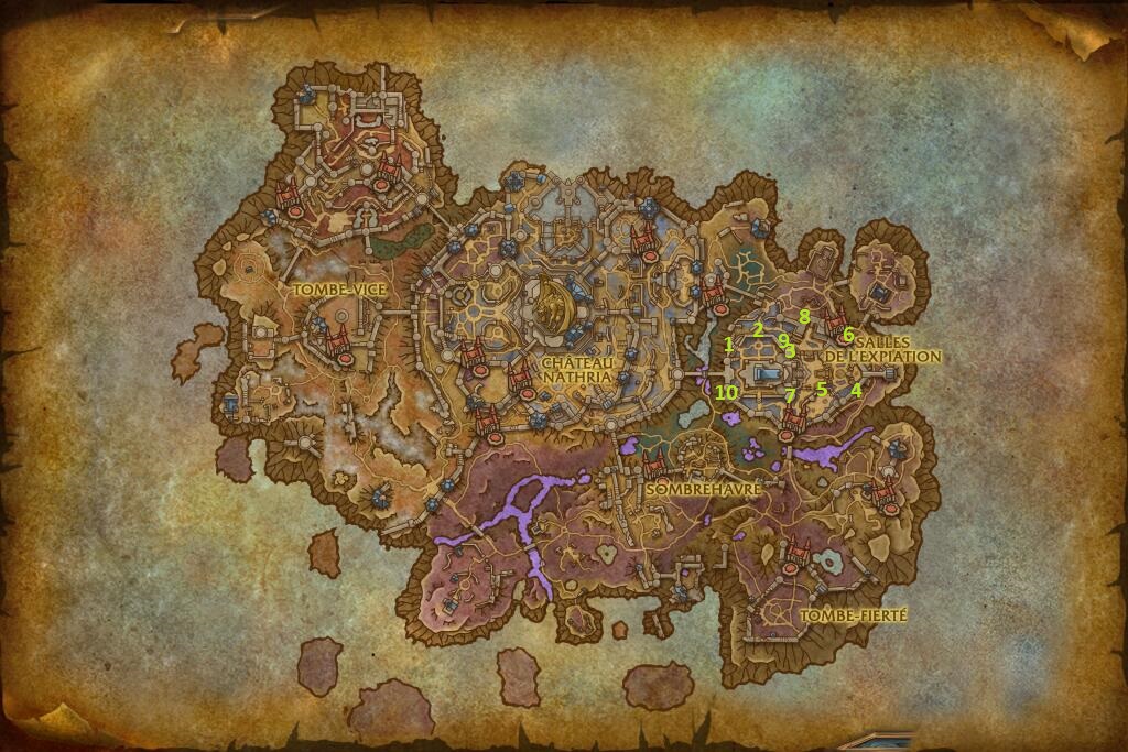 - Réaliser le donjon les Salles de l'Expiation : Peut vous faire progresser jusqu'à être Honoré (10 points de réputation par créatures à l'exception du Bedeau diligent et du Démon de pierre mord-cheville qui vous octroient chacun 5 points de réputation). Les boss vous gratifient de 15 points de réputation excepté pour le Grand chambellan (boss final) qui vous en donne 25. Le donjon peut être réalisé plusieurs fois et les joueurs peuvent recevoir environ Fragments de stèle du vice par parcours du donjon.